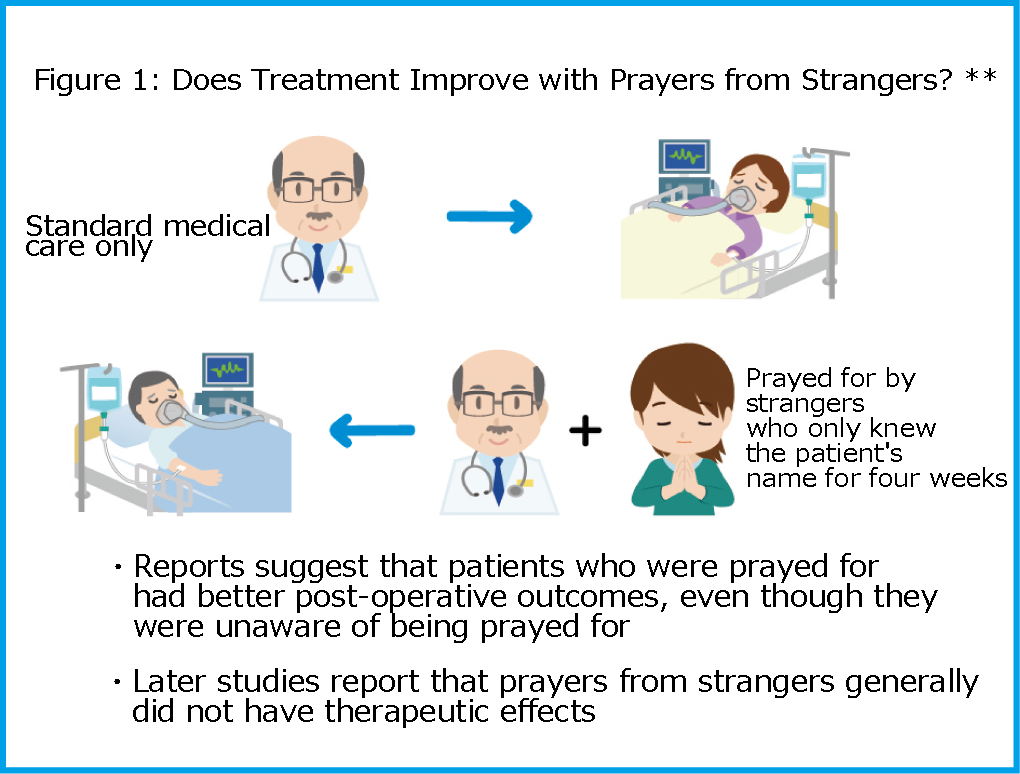 When I worked at a specialized heart disease hospital, I encountered a paper regarding the effects of prayer that I will introduce here (Arch Intern Med 1999;159:2273-78). Patients admitted to the cardiac intensive care unit were divided into two groups: one group received only standard medical treatment, while the other group received standard treatment along with prayers from strangers for the patients (Figure 1).
