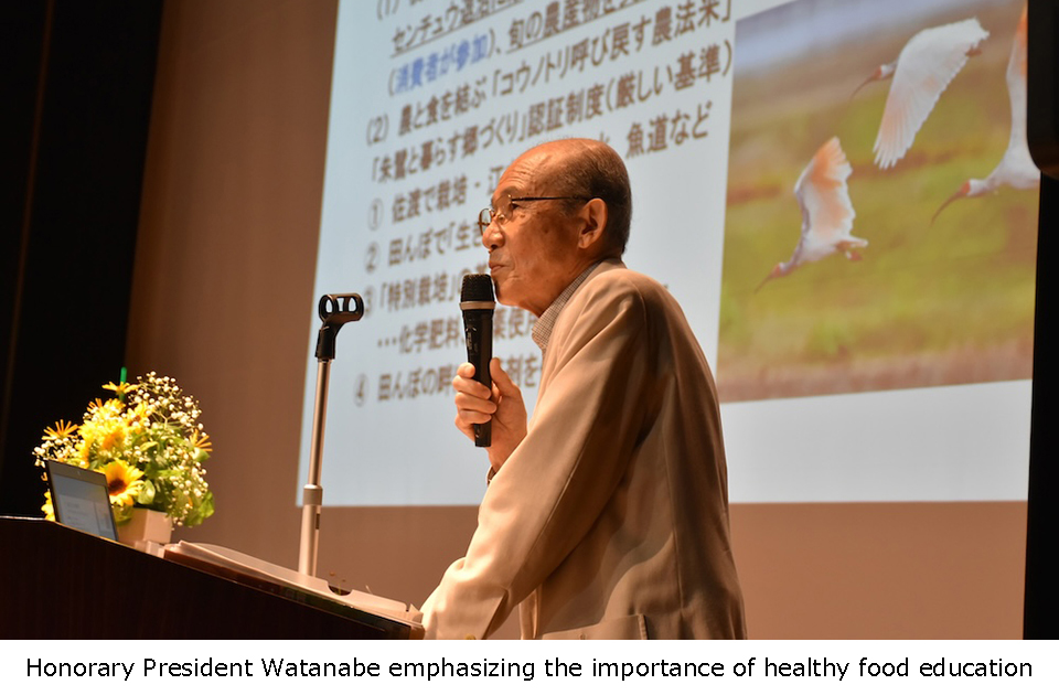 Honorary President Watanabe delivered a lecture titled “Creating the Body with Food, Creating the Mind with the Way of Eating.” He highlighted the correlation between the rising national medical expenses, which have surpassed 48 trillion yen, and the declining rice consumption among the population, emphasizing the importance of promoting healthy food education for children. Watanabe introduced examples such as elementary schools that have set days when 100% of the school lunch ingredients are locally sourced, and schools that have created rice paddies on their premises to teach students about rice cultivation. He explained that these initiatives are supported by the collaboration of families, schools, and communities, with additional support from JA (Japan Agricultural Cooperatives) and local governments.