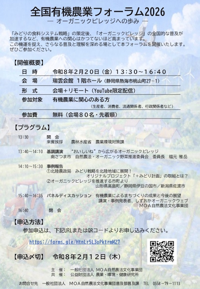 2月20日、全国有機農業フォーラム2026〜オーガニックビレッジへの歩み〜が、静岡県熱海市で開催されます。