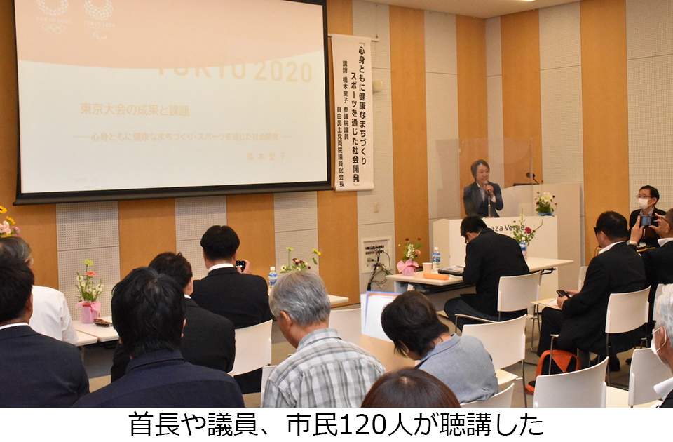 橋本参院議員は「心身ともに健康なまちづくりを通した社会開発」ついて講演。医科大学や学会で統合医療について講演する機会が増えたと昨今の動きを伝え、統合医療への社会の関心が着実に高まっていると強調。慢性腎炎などの病をさまざまなケアで乗り越え、オリンピックに出場してきた生い立ち、コミュニティーの復活によって町の悩みだった町民の引きこもりを解消に導いた鳥取県南部町の営みなどに触れながら、統合医療的ケアの重要性を伝えました。東京オリンピック・パラリンピックでの取り組みにも触れ、スポーツを通じた健康づくりの必要性も紹介し、改めて、いきいきとした地域社会づくりに向かう決意を述べました。